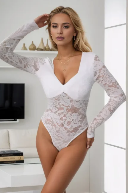 Elevate your wardrobe with this white v neck long sleeve lace bodysuit that combines elegance with modern style. Featuring a delicate lace material with a flattering V neckline and long sleeves, this piece offers the perfect blend of sophistication and comfort. Style it with high-waisted jeans and strappy heels for a night out, or layer it under a blazer for a chic office look. The soft stretch fabric ensures all-day comfort while the classic white color makes it a versatile addition to your collection.